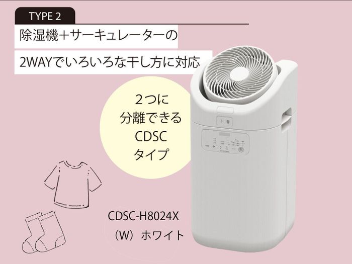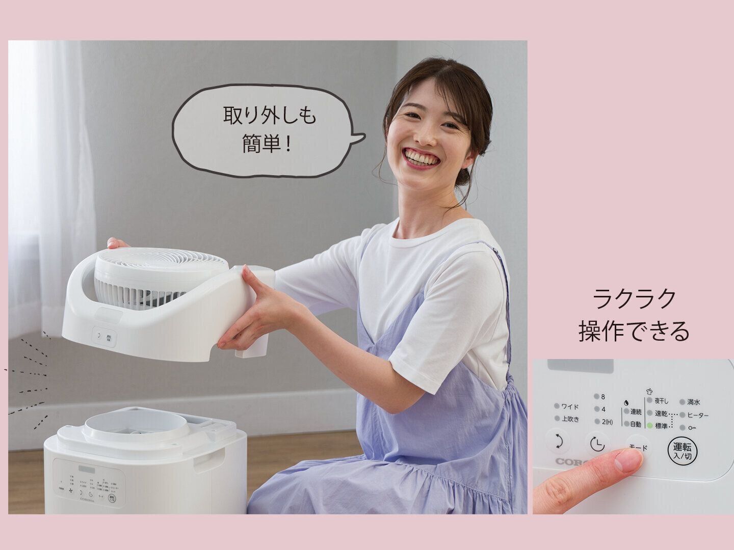 「CDSCタイプ」は一体型として使えるのはもちろん、除湿機本体とサーキュレーターが分離。赤外線通信で連動し、洗濯物の乾き具合に合わせて賢く運転&制御します。「洗濯物の真下に置けるから、部屋干しのスペースが狭くてもむらなく乾きそう」と、佳奈ママも大満足の様子。