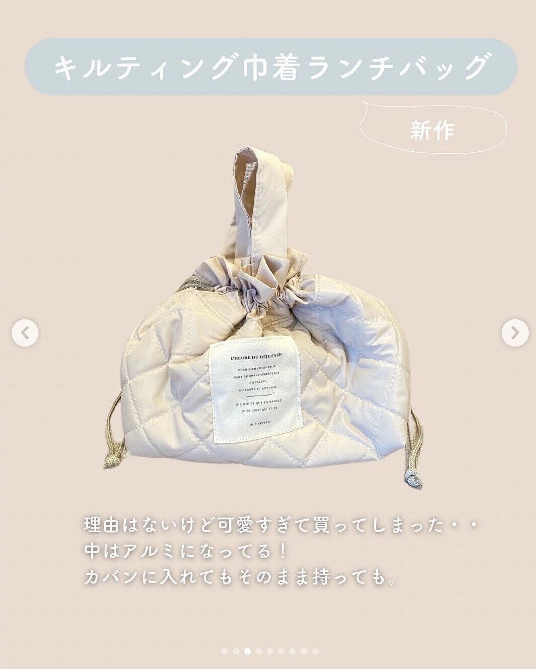 こちらはmisako_baby_yogaさんが「理由はないけど可愛すぎて買ってしまった」という3COINSの「キルティング巾着ランチバッグ」。キルティングで中綿が入っていて厚みがあるので、保冷効果が期待できそうですね。内側も保冷素材になっているようです。持ち手付きで持ち運びにも便利そうですね◎