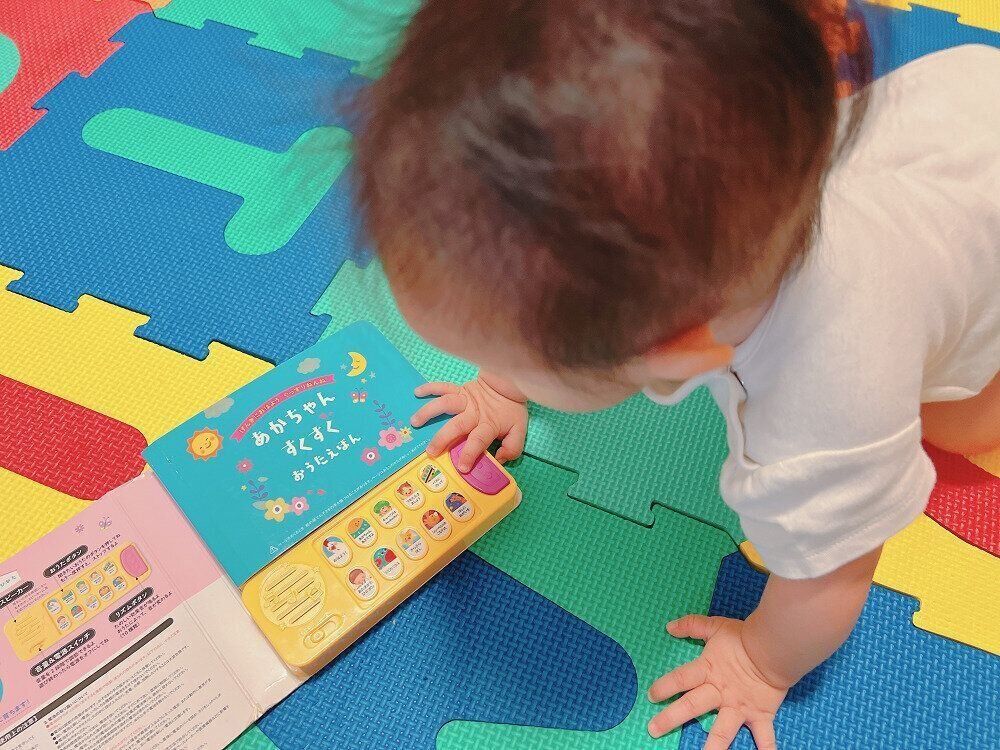 上の子に続き「あかちゃんすくすく おうたえほん」が大のお気に入り。「キャベツは〜」の歌を歌うとご機嫌に聞いてくれます。最近はボタンを自分で押そうとしたり前のめりで遊んでいます。