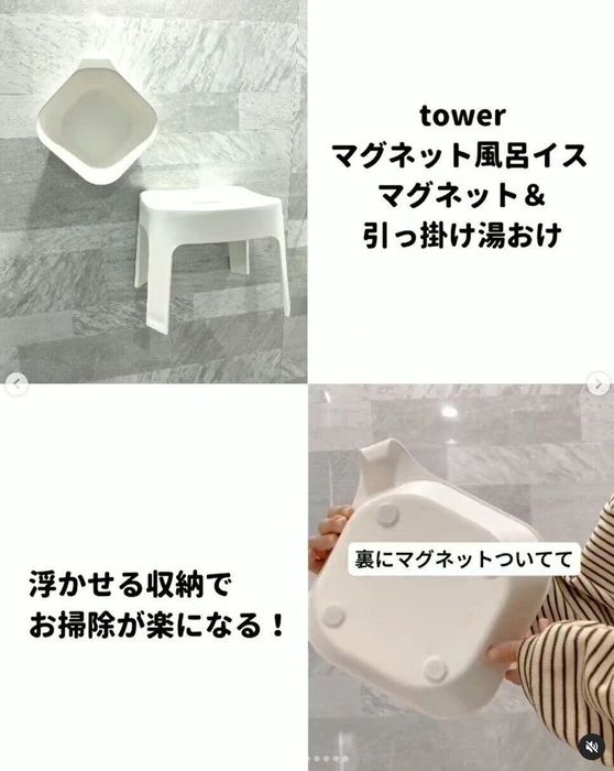 ゆっかさんは、tower(タワー)の「マグネット風呂椅子」と「 マグネット引っ掛け湯おけ」を購入。マグネットで壁にくっつけることで、浮かせて収納できる優れものなんだとか!ヌメリ防止にもなるのも◎。お掃除がラクになるのも嬉しいですね♪