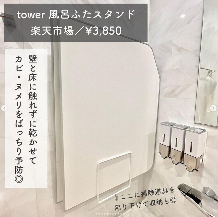 SAYOさんは、tower(タワー)のマグネット風呂ふたスタンドを購入。壁と床に触れずに乾かすことができ、カビやヌメリも予防できるんだそう♪ スタンドの下部分にフックなどをかけられるスペースがあり、掃除道具を吊り下げても◎。見た目がシンプルなのもカッコよくて良いですよね。
