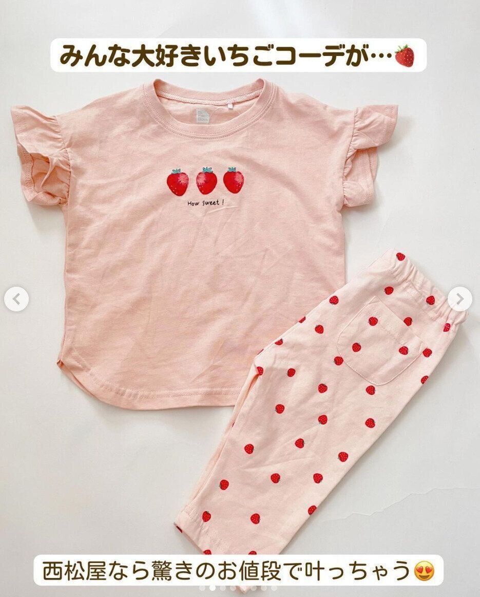 こちらはyuzuko1234さんが購入した、イチゴ柄の半袖Tシャツと7分丈レギンス。どちらもかわいいデザインで、キッズも喜んで着てくれそう!Tシャツは綿100%素材で汗をしっかり吸収してくれますし、レギンスは綿×ポリウレタン素材なのでストレッチ性が高く、子どもも動きやすいですよ♪ Tシャツは394円、レギンスは438円と、それぞれワンコイン以下でゲットできるのも嬉しい!