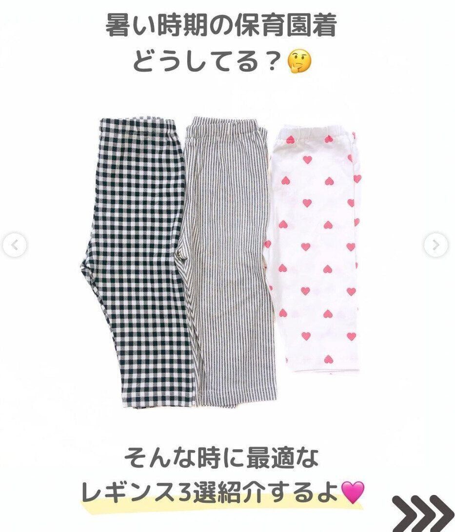 rin_sisters.7さんがゲットしたのは、西松屋のレギンス3点。気温が高くなる夏の保育園着には、こちらのような7分丈や5分丈のボトムスを選びましょう。3分丈などの短いボトムスは涼しいですが、転んだときにケガをしやすかったり、虫刺されや日焼けが気になったりというデメリットも。特にまだハイハイをしているような低年齢の子どもは、ひざの出ない7分丈がおすすめです。7分丈レギンスは1点あたり438円、5分丈レギンスは427円で購入できるので、たくさん着替えが必要な保育園着にぴったりですよね!