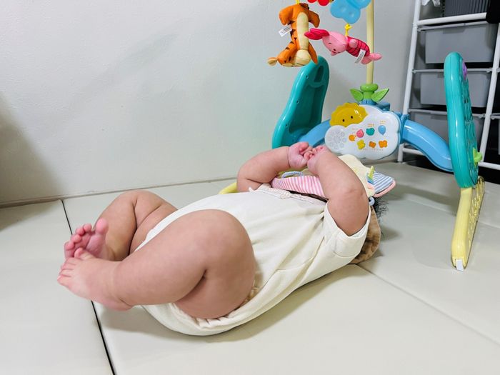 エムコ 首がすわって、ねんねのころとは見える景色が変わったことが楽しいみたいです。お散歩に行くと景色が違うのが新鮮らしく、キョロキョロしてすごくご機嫌です。体もしっかりしてきたから、私のすねに赤ちゃんをうつぶせに乗せて支えて、飛行機みたいに上下させてあげるとケタケタ笑って喜んでいます。そんなふうに触れ合い遊びができるようになってきたのもうれしいです。