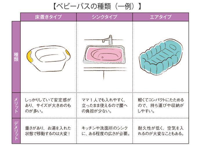 ベビーバスには、軽くて持ち運びしやすい「エアタイプ」、立ったまま使える「シンクタイプ」、しっかりと安定感がある「床置きタイプ」などがあるので、「どこで」「だれが」沐浴させるのか、産後のお世話シーンをシミュレーションして選ぶのがポイント。また、ベビーソープにも手間いらずの「泡タイプ」、余分な成分が入らず安心の「固形タイプ」があるので、メリットとデメリットを考えて選びましょう。そして、沐浴後は保湿を忘れずに! しっかりスキンケアをして、デリケートな赤ちゃんの肌を守ってあげることが大切です。