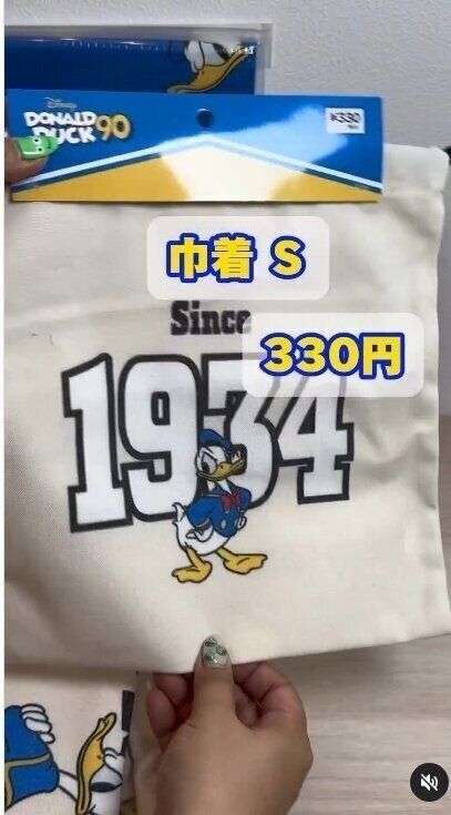 330円商品の巾着は、ドナルドがスクリーンデビューした年「1934」が大きく描かれ、シンプルながらもしっかりとインパクトのあるデザイン!何かと使えていくつあっても困らない巾着は、ついつい買いたくなってしまいますよね♪