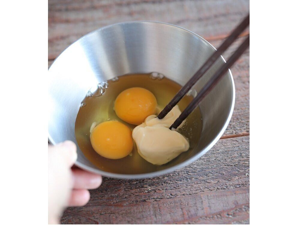 卵1個につき、大さじ1のマヨネーズを入れてよく混ぜ合わせてから火をとおすと、卵がふわふわに仕上がります。