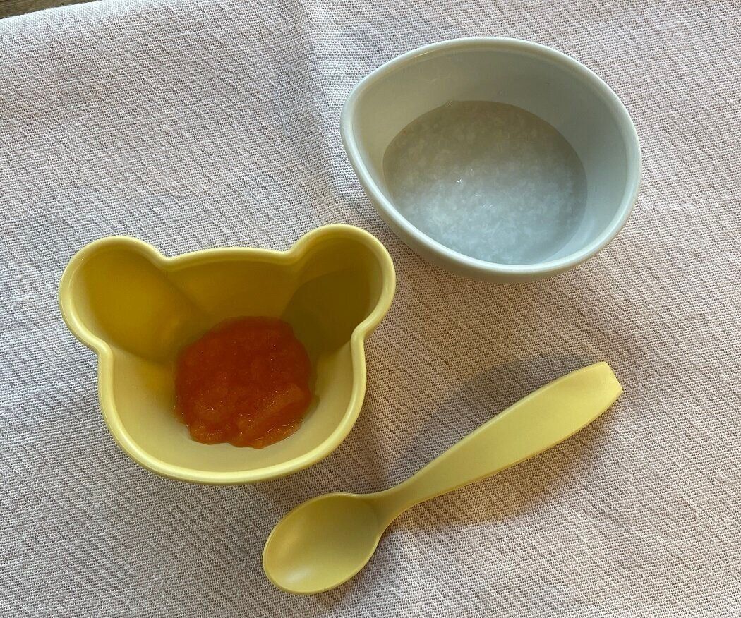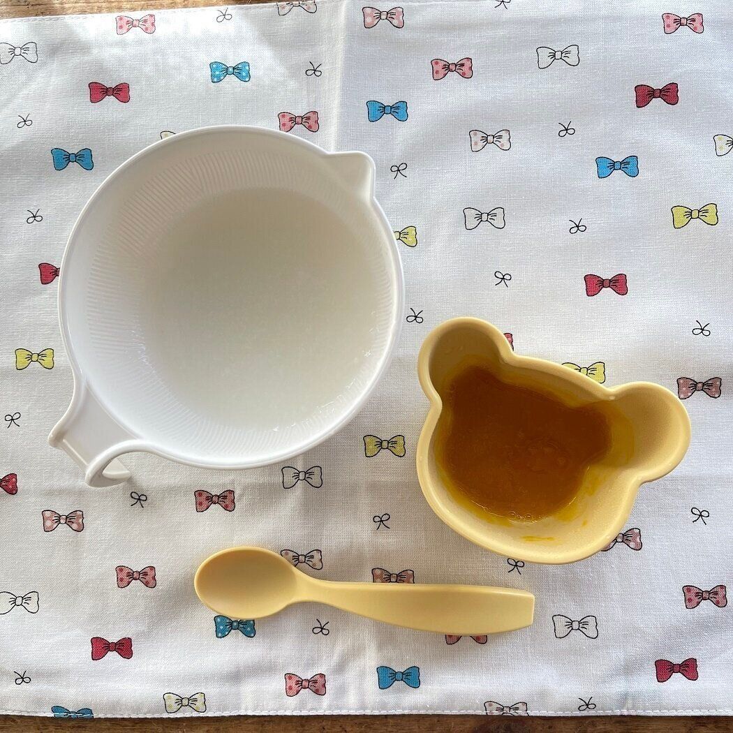この日のメニューは、息子も大好きな10倍がゆに、ほんのり甘いかぼちゃペースト。10倍がゆは小さじ4、かぼちゃペーストは小さじ1を用意しました。手間いらずでお皿に移すことなく、すり鉢で直接混ぜてあげるスタイルに。これが意外と便利で(笑)、食べやすくていいんですよね。