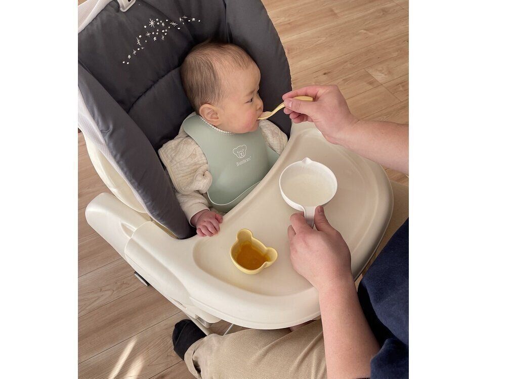 食べさせるタイミングも難しいですね。おなかがすきすぎて泣いてしまうと、椅子に座らせるのもひと苦労。ご機嫌の空腹時をねらってあげるのがコツです。