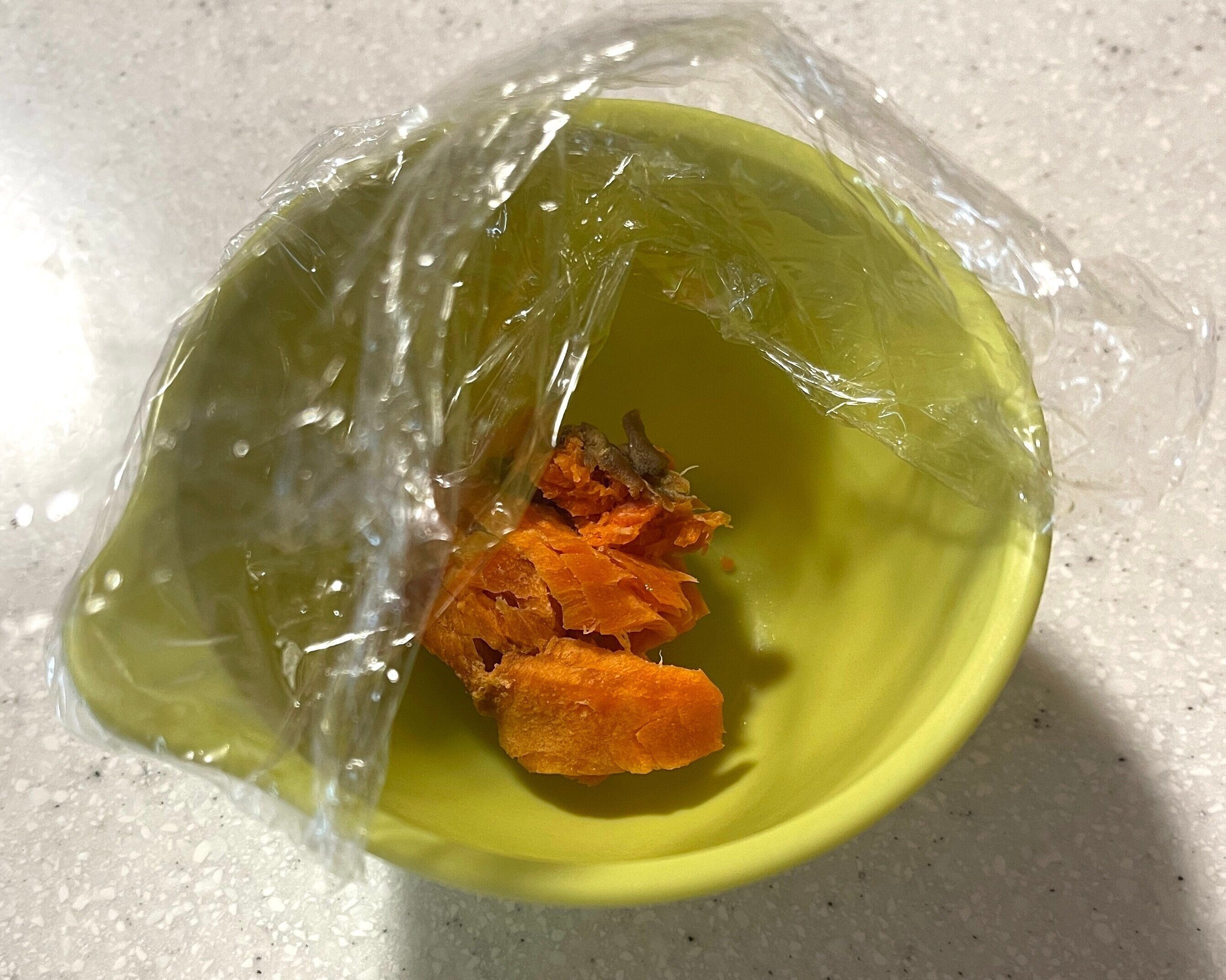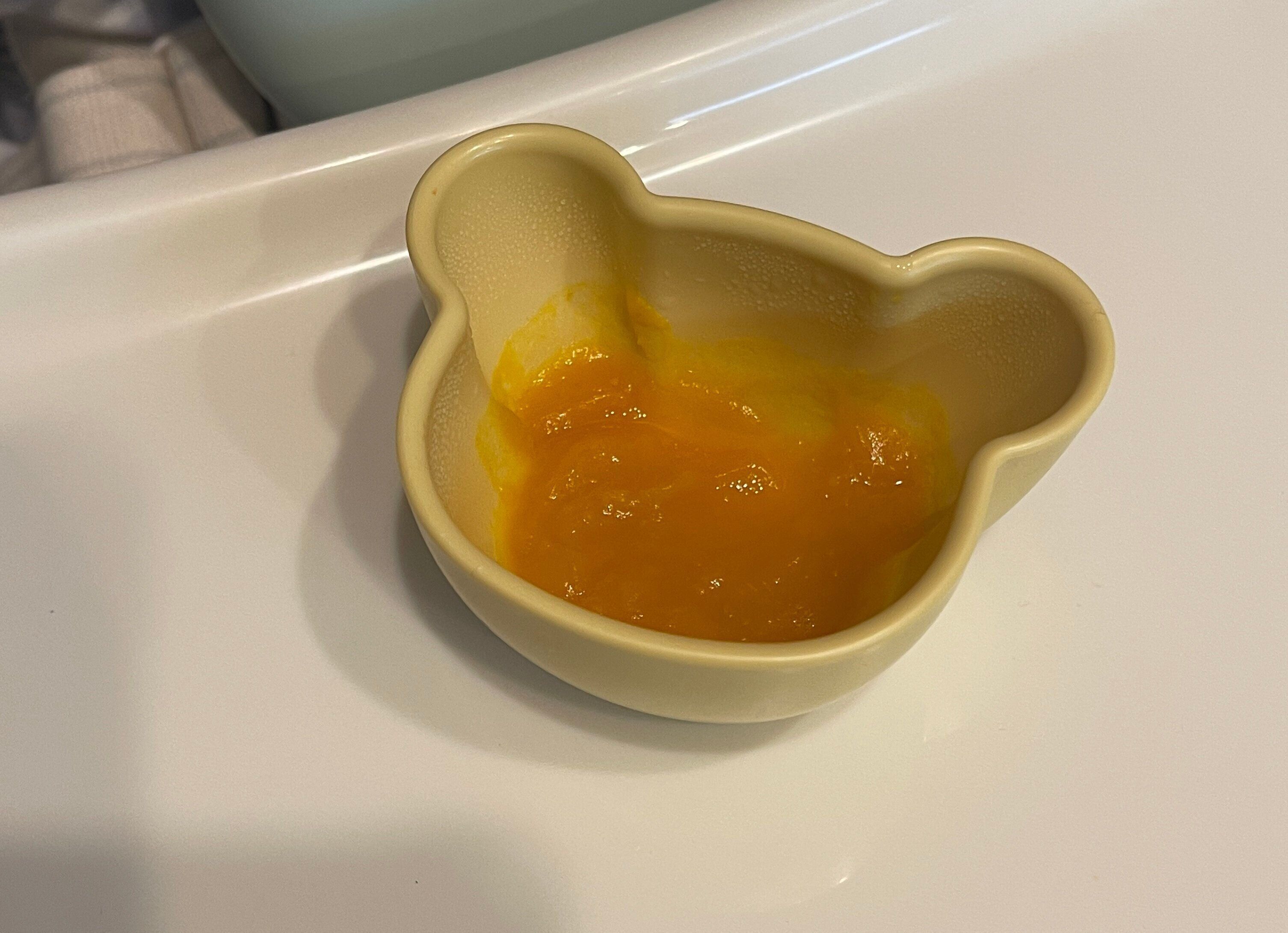 続いてあげたのはかぼちゃ。かぼちゃはレンジで加熱して簡単につぶせるので、とっても楽ちんでした。甘みがあって、赤ちゃんも大喜び。