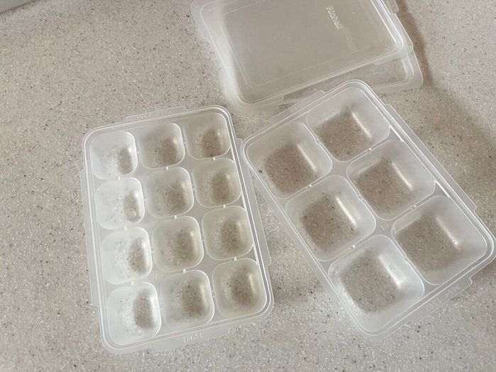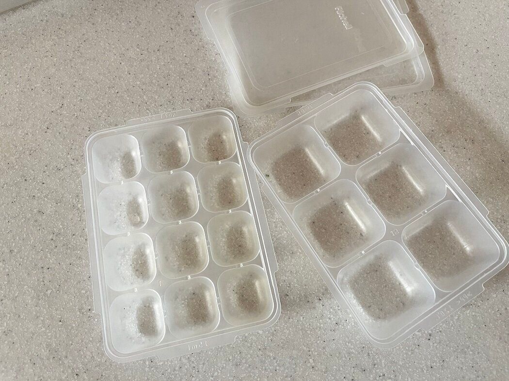冷凍したものの解凍は、レンジで数10秒行うのがベスト。分量に応じて秒数の感覚はつかめてくるけれど、最初は10秒単位で刻んだほうがよかったです。粗熱を取ってから食べさせます。再冷凍は避けましょう。