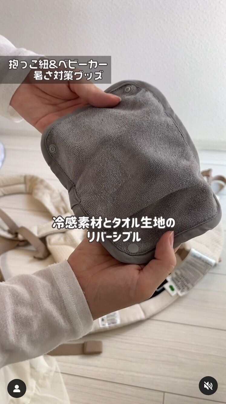 こちらはmamo___babyさんが3COINSで購入した抱っこ紐用の冷感よだれパッド。肩紐と胸元のカバーがセットになっていて、ボタンで抱っこ紐に取り付けられるようです。冷感素材とタオル生地のリバーシブルになっているとのことで、シーンに合わせて使い分けられて便利そうですね◎