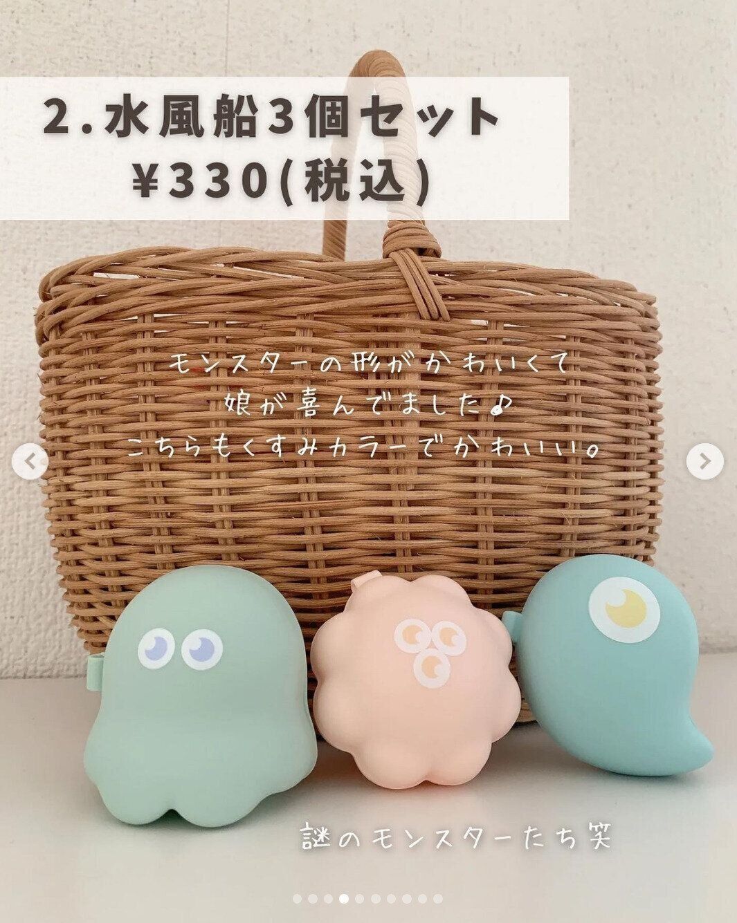 こちらはmei_days2さんが、ついついカゴに入れてしまったという3COINSの水風船3個セット。投げたり握って感触を楽しんだりして、お子さんはずっと遊んでいたんだとか。可愛いモンスターのデザインにも喜んでいたそうです♪