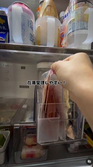 ついつい積み重ねてしまいがちなハムやベーコンなど。積み重ねると賞味期限が見えにくく、在庫の把握もしにくいですよね。そこで便利なのがダイソーの「袋調味料収納ケース」です。薄くて立てにくいハムやベーコンもスッキリと立てて収納できます。賞味期限の記載欄が手前にくるように入れておけば賞味期限も在庫も一目瞭然ですよ!