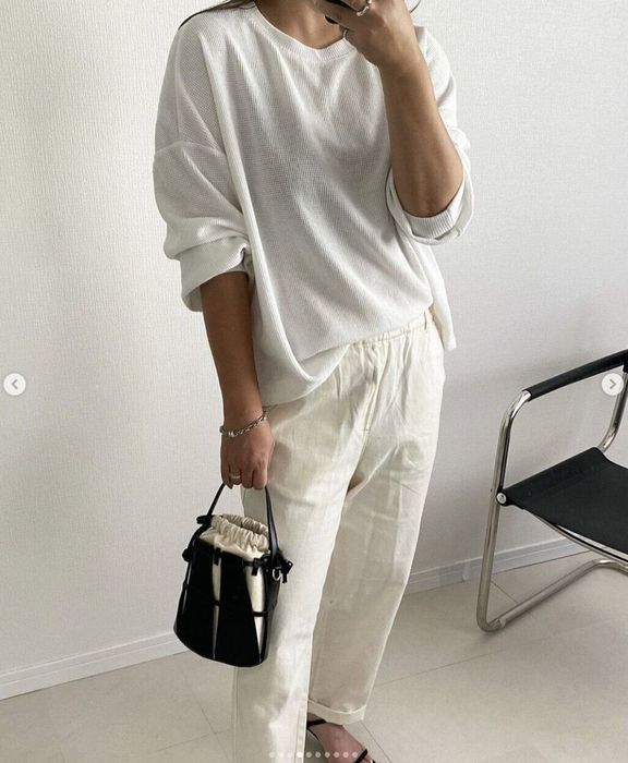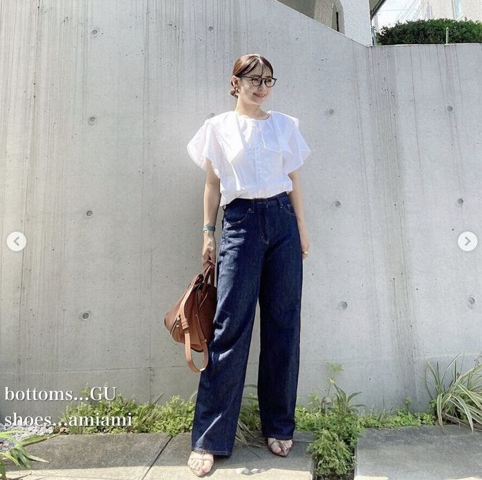 ATSUKOさんは、しまむらのビッグカラーブラウスとGUのデニムを購入。デニムと組み合わせることでカジュアル感が出ますが、ブラウンのバッグと華奢なサンダルを取り入れると優雅な印象に仕上がります。デニムのほかにスラックスパンツと合わせると、グッとよそ行き感が出てオンモードに♪ ふんわりした白ブラウスには、どんなボトムスを合わせてもリッチな印象に仕上がるので一枚あるとGoodです!