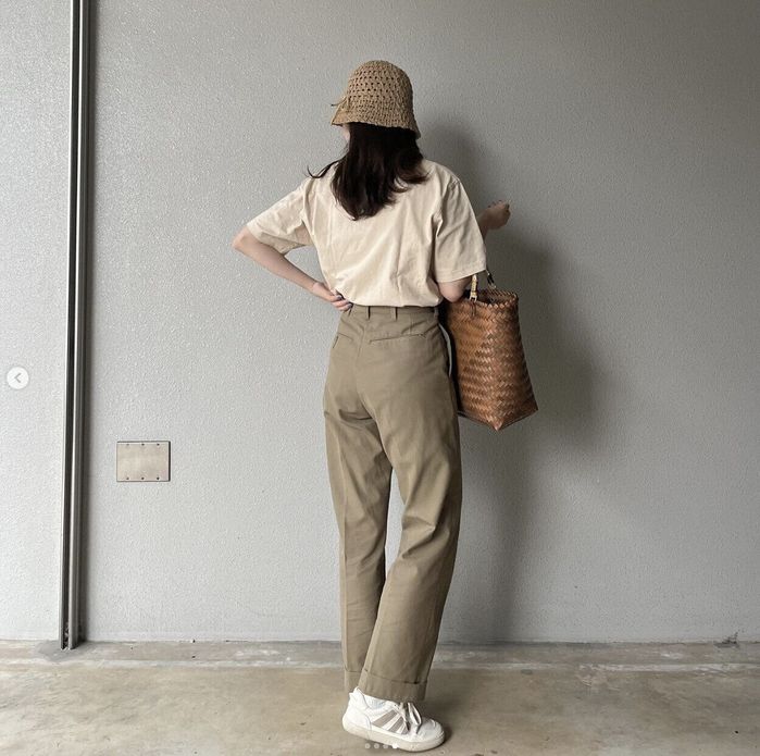 Kさんは、shinzoneのチノパンを使ったベージュのワントーンコーデを。タック入りのパンツは、シルエットがキレイに見えるので重宝します。画像のコーデでは、帽子とバッグもトーンをそろえてリッチな印象に見えるので、スニーカーをはくことで抜け感のあるコーデに。サンダルやミュールに変えると、洗練されたオンモードに早変わり!トーンをそろえるとあか抜けた印象に仕上がりますよ。
