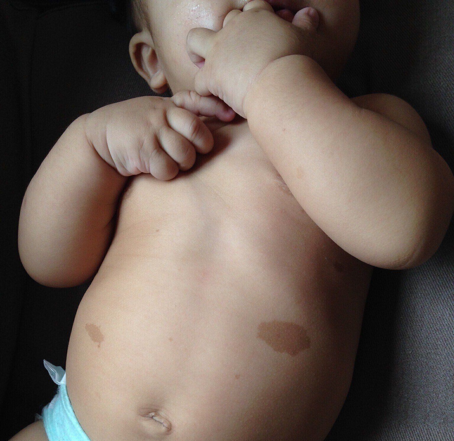 「紬乃の体に、薄い茶色いシミがいくつか見られるようになりましたが、紬乃は肌の色が黒いほうなので、そんなに目立つ感じではありませんでした。『薄いシミがあるな~』とは思っていましたが、元気だしミルクも母乳もよく飲むので深刻には考えていませんでした。