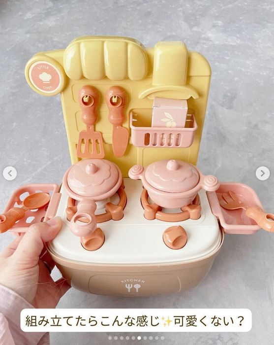 こちらはyuzuko1234さんが3COINSで購入したキッチンセット。組み立て式で、土台のボックスにパーツを収納できるようになっているんだとか。550円だったようですが、「くすみカラーがツボすぎるし、お値段もリーズナブル!」とコスパのよさに満足している様子。お子さんも大興奮で遊んでいたようです◎
