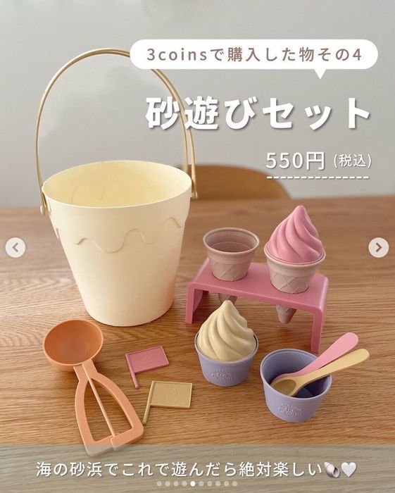 こちらはdori_ismartさんが3COINSで見つけた「砂遊びセット」。夏休みに海へ行く予定があり購入したんだとか。「海の砂浜でこれで遊んだら絶対楽しい」と使う日を楽しみにしているようです♪ こちらは550円商品とのこと。