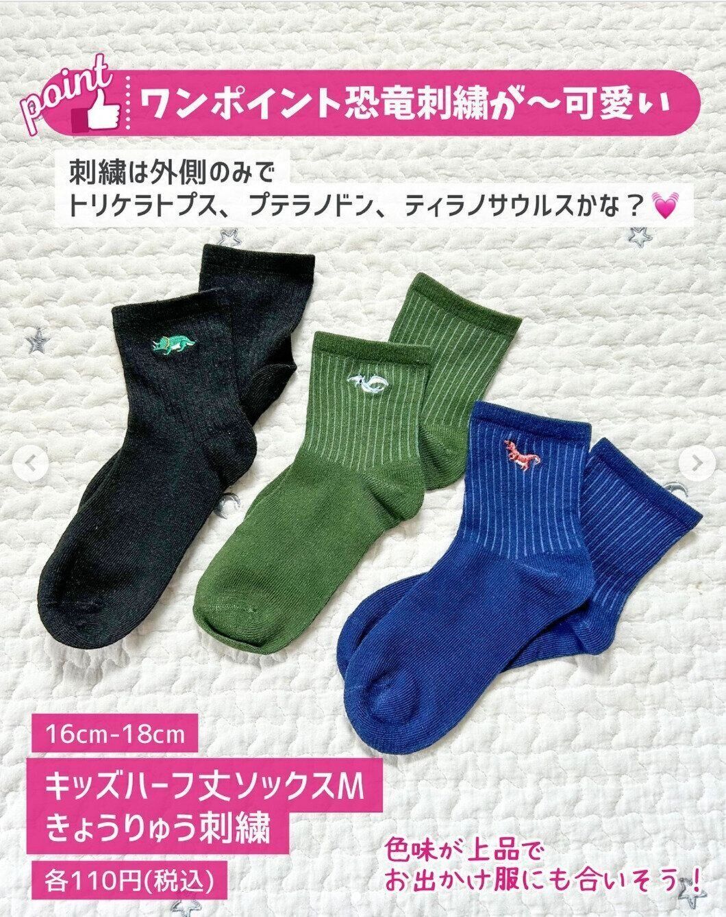 yuri_mama.kosodateさんがセリアでまとめ買いしたのは「キッズハーフ丈ソックスM きょうりゅう刺繍」。サイズは16~18cmで、外側にのみワンポイントの恐竜刺繍があるんだとか。「色味が上品でお出かけ服にも合いそう!」とのこと◎