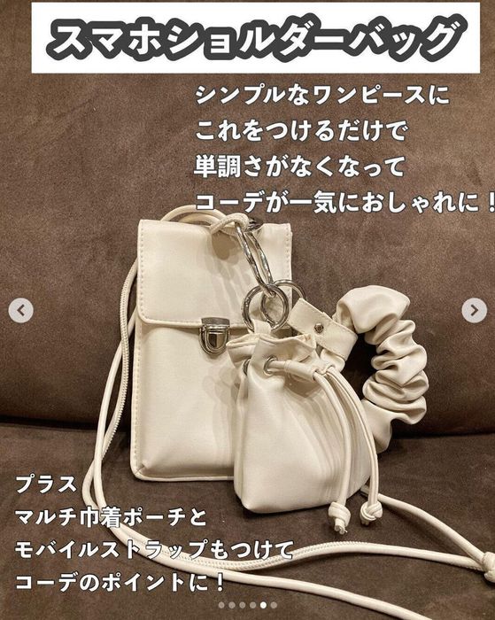 こちらは_kobito_fashion.hairさんが3COINSで購入した「スマホショルダーバッグ」。シンプルなワンピースと合わせると単調さがなくなって一気におしゃれになるとのこと。この方のように別売りの「マルチ巾着ポーチ」や「モバイルストラップ」と組み合わせて使うと、さらに使い勝手も良くなりそうです♪