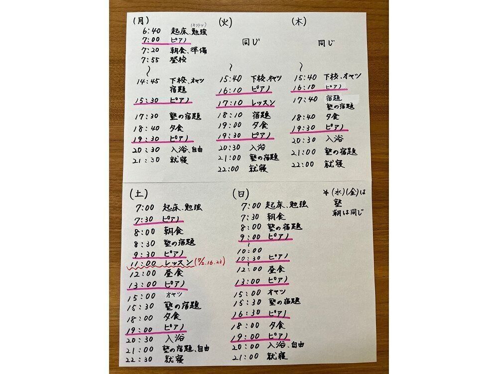 一時退院のときは、ピアノのコンクールの直前だったこともあり、1週間のこまかいタイムスケジュール表も作りました。病院に戻ってからも、「予定どおりやっている?」と確認をして。