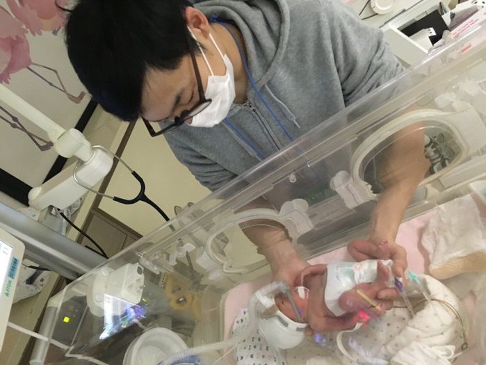 柚日ちゃん生後1カ月、900gくらい。パパが初めて保育器内で抱っこしました。