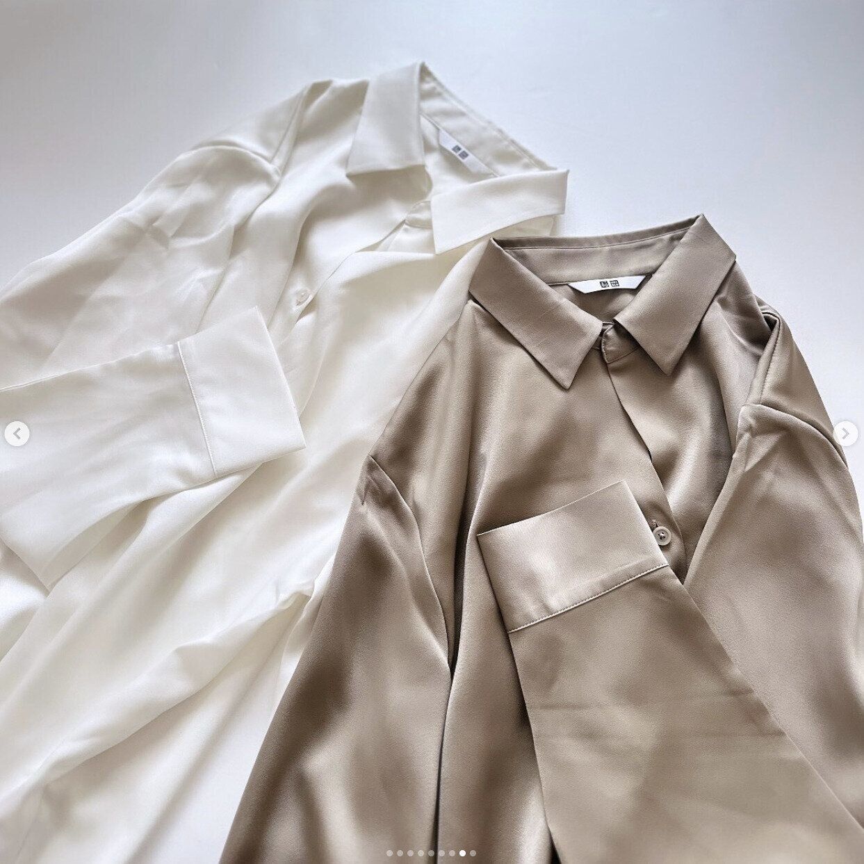 MACOさんは、ユニクロの「サテンブラウス」を購入。この艶感と、とろんとした素材感で、秋コーデが何倍にも楽しめるアイテムです。右のブラウスはベージュカラーですが、シャンパンゴールドを感じさせるような上品さで、着るだけで華やかなコーデに◎。濃い目のデニムや、黒やブラウンなどの小物類と合わせると、品のあるコーデに仕上がります。