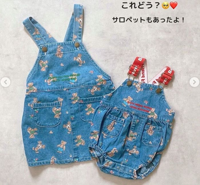 こちらはmichi_yon110さんがバースデイで発見した、ジャンパースカートとロンパース。ここ数年トレンドとして人気を集めている、くま柄のデザインです。キッズとベビーの両方で展開されており、「きょうだいでリンクコーデを楽しみたい」という人にもおすすめ。インナーしだいで印象を変えられるので、コーデがマンネリしがちな人にもぴったり♪ 夏はもちろん、インナーを長袖にすれば、涼しくなっても着ることができますね◎
