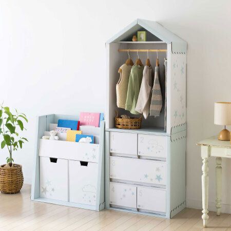 衣類や靴下などの小物やおむつなどがすっきり収納できる引き出し、ハンガーラック、絵本とおもちゃ用のブックシェルフと、子ども部屋に必要な家具の3点をセット。ママ一人で簡単に組み立てができる手軽さも魅力です。