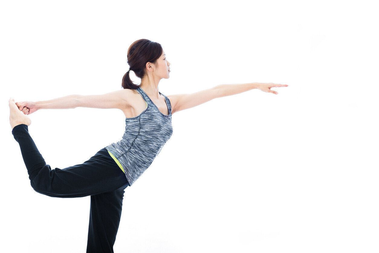 まっすぐに立ち、蹴り上げるように後ろに上げた右足の足首を、右手で持ちます。左手は前に伸ばしてバランスをとります。ゆっくりと左手はやや斜め上に、掴んだ右足は少しずつ持ち上げて5〜10呼吸する間キープします。反対側も同様にしましょう。慣れるまではグラグラするので手は壁や柱などをつかんで体を支えると良いと思います。