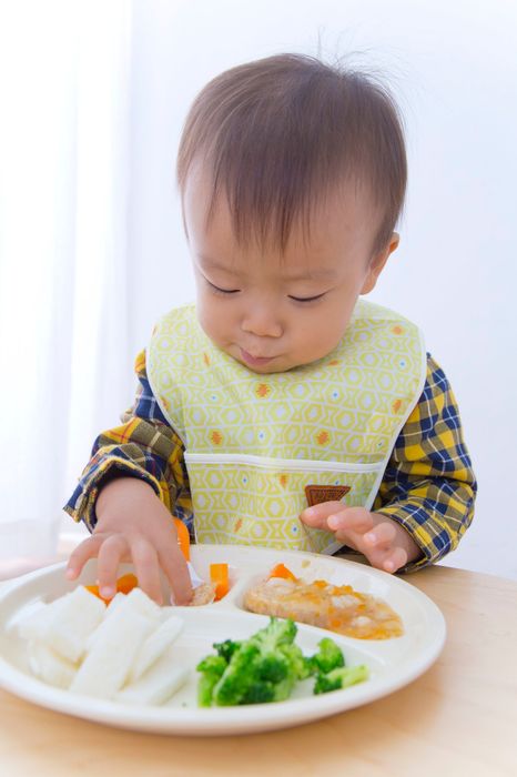 自分から食べ物に手を伸ばしたり、手づかみ食べをしたりするようになったら参考にして。大人はあまり手を出しすぎず、サポートする程度に。食事中に手で食べ物をつかんだり、落としたりすることも、手や口の発達、好奇心を育てるための大切な過程です。