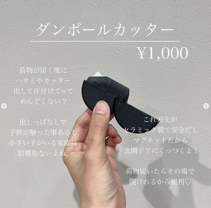 misakiさんは、こちらのダンボールカッターを購入。荷物が届くたびにはさみを出すのがめんどう...というかたにおすすめなんだそう。マグネットつきなので玄関ドアにくっつけることもでき、荷物が届いたらその場で開けられて便利!コンパクトサイズなのもうれしいですよね♪