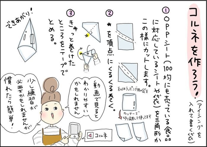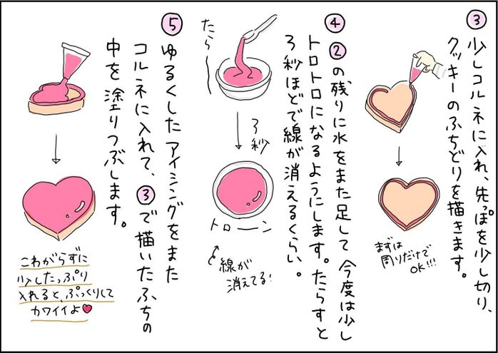簡単に流れを説明しますと、卵白(乾燥卵白を使ってください:製菓材料店で売っているパウダー)と粉糖を練ったものを、コルネという袋に入れてクッキーに絵を描いたりします!