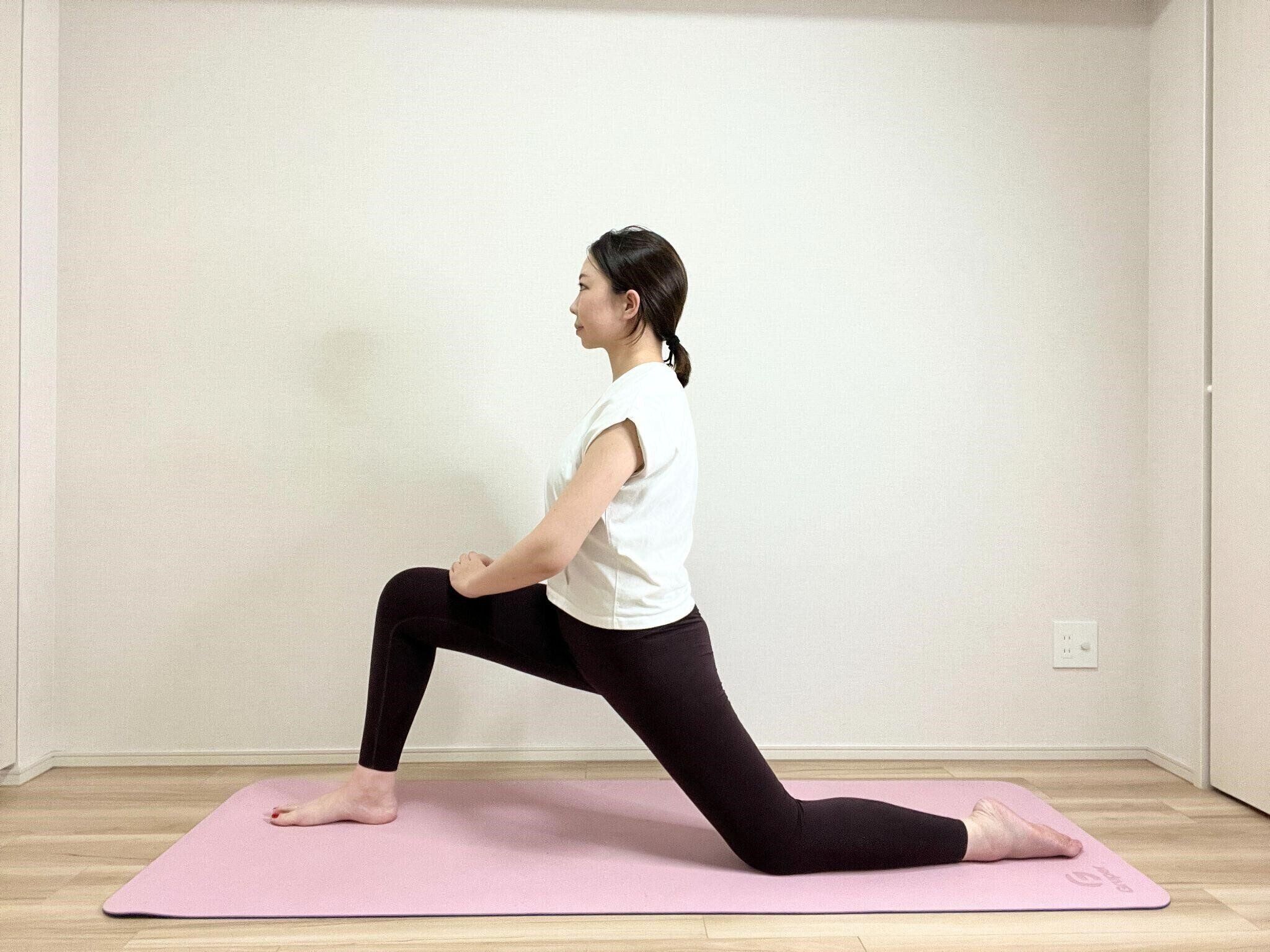 重心を下げる際には肩の力を抜いて、前のひざがつま先より前に出ないように注意します。安定せずにグラグラする場合は後ろの脚を外側にずらして腰幅を広くしてみましょう。股関節周りの筋肉をほぐすことで、リンパの流れや血流がスムーズになります。そのため、痩せやすくなるだけでなく、むくみ解消にも効果が期待できますよ。