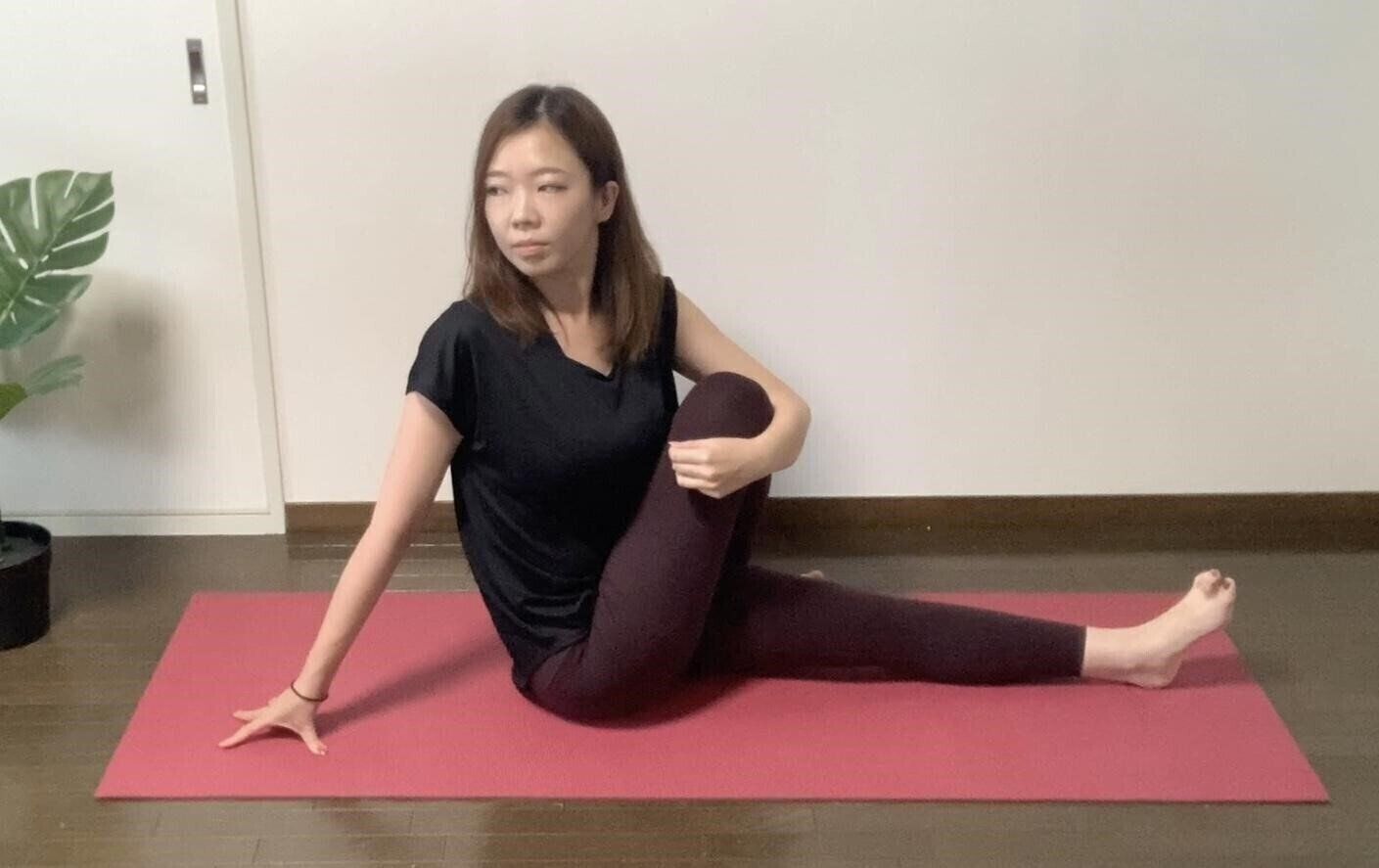 脚のつけ根から上半身をねじり、目線は後ろに向けます。肩が上がりやすいので、肩の力は抜いて首を長く保ちましょう。おなかや腰周りをねじることで腸が刺激されるので、便秘解消の効果も期待できます。