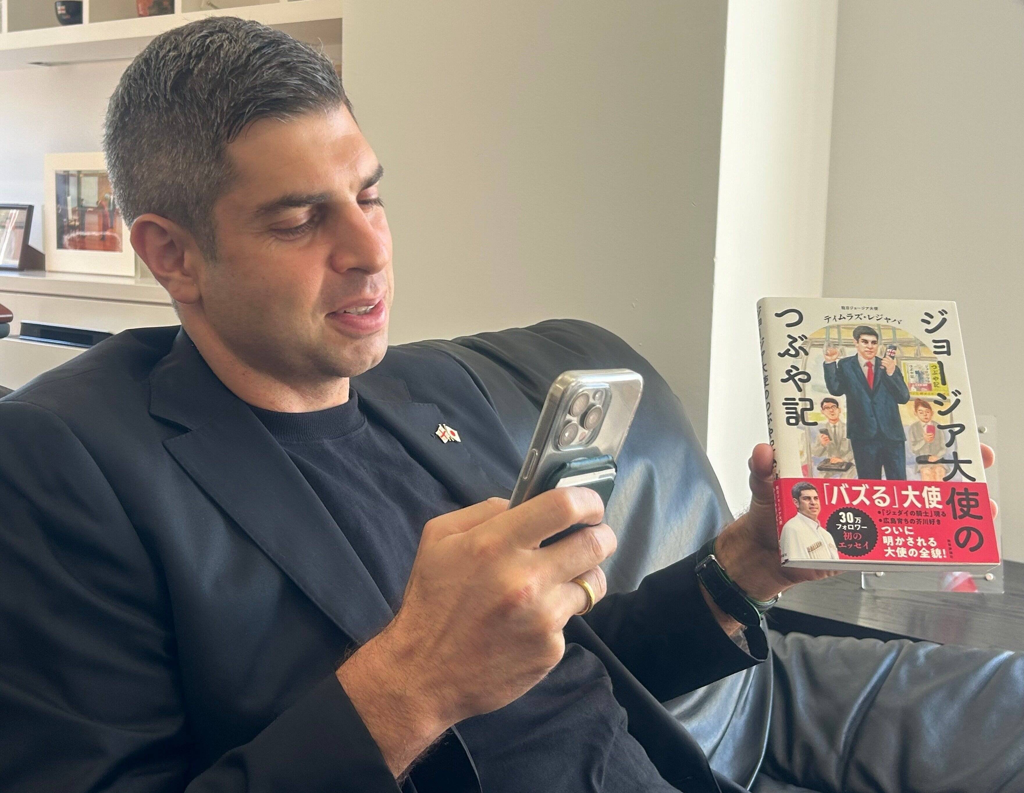 インタビューは、東京都港区にあるジョージア大使館で行われました。大使はとてもフレンドリーで、取材中にスマホでインタビューの様子を撮影。すぐにXに投稿していました。