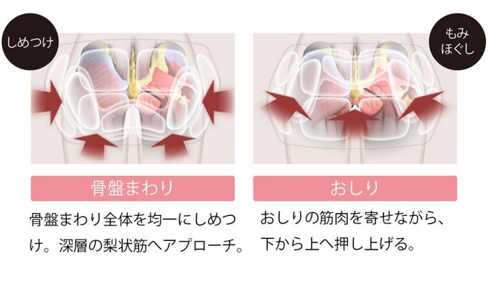 自分ではほぐしにくい、骨盤まわりやおしりの深層筋までアプローチできるエアーマッサージャー。15個のエアーバックが骨盤おしり全体を持ち上げ、おうちにいながら、ちょっとしたすき間時間で、プロに学んだマッサージを。