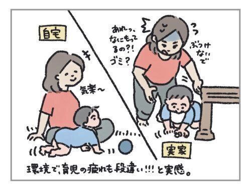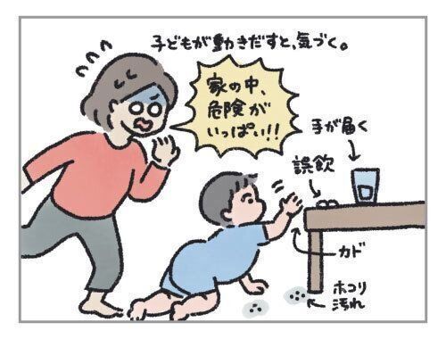 ベビーゲートをつけたり家具をカバーしたり、いろんな工夫をして、自宅が過ごしやすい空間になりました。ところが今度は、実家に連れていくと、机のカドや家具の金具、ハサミや薬が机に置いてあったり・・・ヒヤヒヤするポイントがたくさん。短時間見ているだけでも気が休まらず、すっかり疲れてしまいました。赤ちゃん仕様にした空間と、そうでない空間では、同じ子守でもこんなにストレスが違うものかと、びっくり!