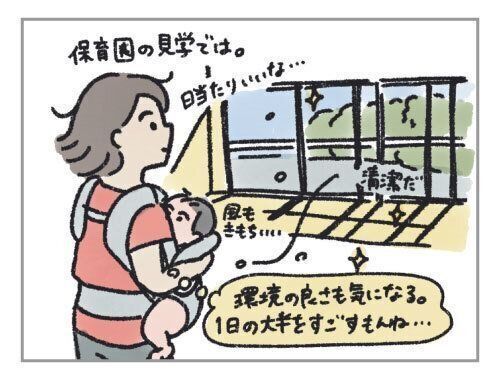 保育園の見学では、安全面だけでなく、環境としての良さも気になりました。感じの良い保育園は、日当たりや風通しが良く、清潔で、なんとなく気持ちの良い空間。我が子が一日の大半を過ごすと考えると・・・建物が新しくなくてもいいし、特別なオモチャもなくていいけど、こういう当たり前に気持ちの良い空間って、いいなあと思ったのです。