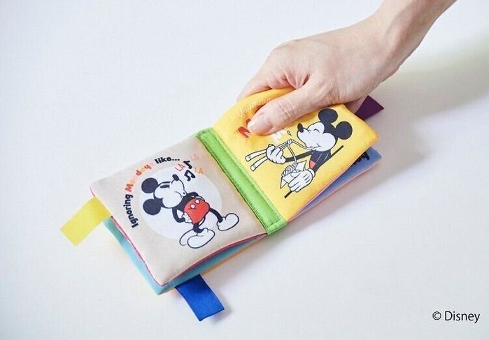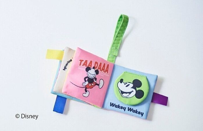 布絵本を触ると、赤ちゃんが大好きなカシャカシャという音がします。さらに、3つリボンがついているので、赤ちゃんが飽きずに遊べるのも特徴です。表情豊かなミッキーマウスのデザインも楽しい!
