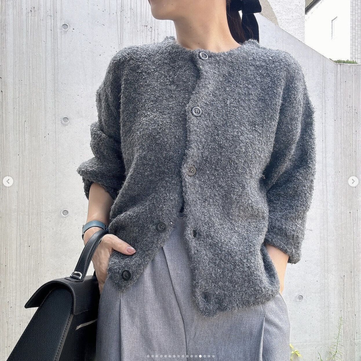 ATSUKOさんは、COCAの「ペンギンスリーブブークレカーディガン」を購入。空気を含んだようなふんわりと柔らかい質感で、いつまでも着ていたくなるほど気持ちの良い肌触りです。ボタンの留め具合でいろんな着方が楽しめ、肩掛けにしてもおしゃれなのでまさに万能!秋口はちょっとしたミニコートとしても活躍してくれます。