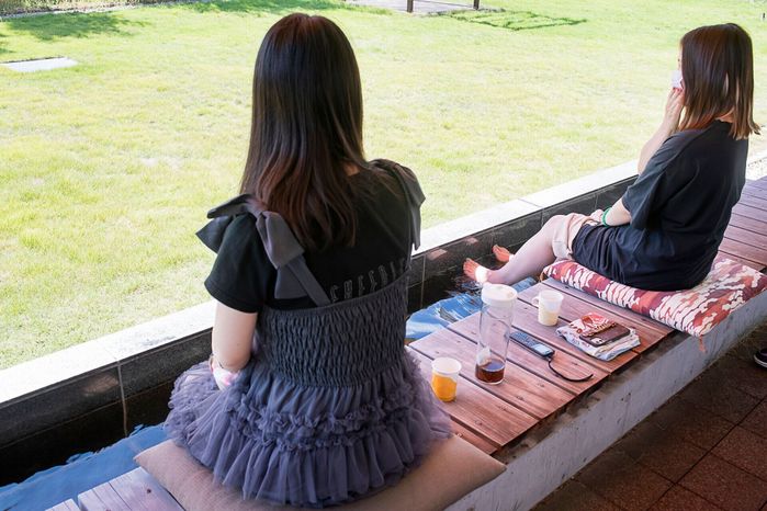 取材班が訪れた日は、朝の骨盤体操レッスンを終えたママたちが、足湯につかりながらおしゃべりしていました! 足湯は血液のめぐりをよくするので、疲労回復や母乳分泌にもいいそうです。