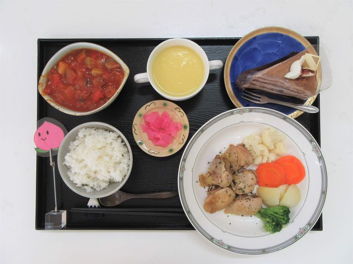 ある日の食事。「ママの里」の場合、食事は近所の「シャトレーゼホテル 旅館 富士野屋」から届きます