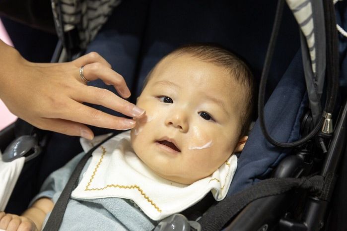瑛綺くん(6カ月)の肌荒れが気になっているという、田自邉 愛さん。「どちらかというと、濃厚なテクスチャーが好きなので、私はクリームタイプが気に入りました。塗った後はサラサラしているのもいいですね」。お顔にクリームを塗ってもらった瑛綺くんも、気持ちいいのかご機嫌でした!