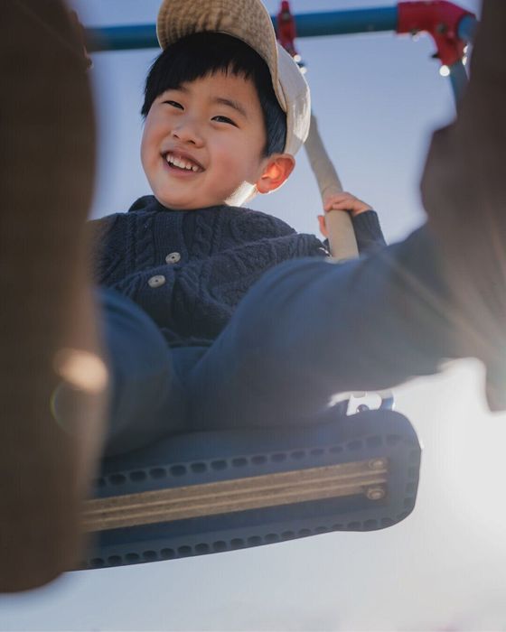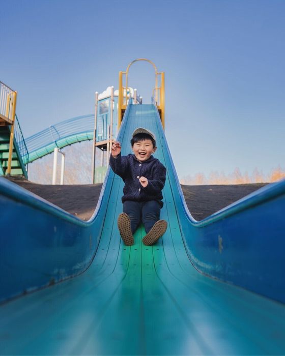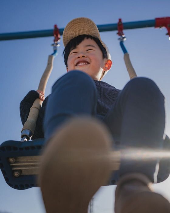 実際はブランコが上がる高さが低くても、下から思いっきり煽ることでダイナミックな写真に。煽っても子どもの顔をしっかり写せるので、楽しそうな表情も逃さずに捉えることができます。