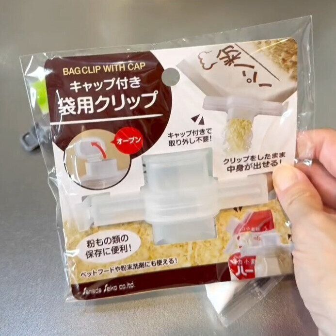 ちゃぽさんは「キャップ付き袋用クリップ」を購入!粉ものを保存するのに便利で、キャップをさしこんだらクリップで留めるだけで良いんだとか。片栗粉をしまうときにいつも粉が舞ってストレスだったそうですが、こちらを使ったら粉がこぼれなくて最高だった!とのこと。少しずつ使うのにも役立ちますよね♪