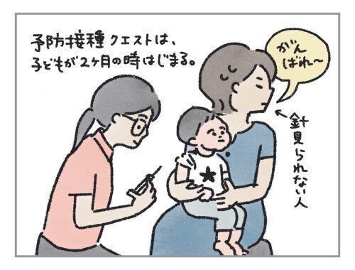 赤ちゃんの予防接種。生まれて2ヶ月もたつと、小さな体に初めての注射を打つことになりました。打つ時に、子どもが暴れないように抑えながら、「頑張れー!」と声をかけながらも、怖くて針が見られない私・・・。