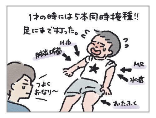 1才の時にはなんと、5本同時接種しました!両腕に2本ずつと、太ももに1本・・・。足にも予防接種できるって、初めて知りました。これも、強くなるための試練・・・!!このおかげで、安心して保育園に通えます。