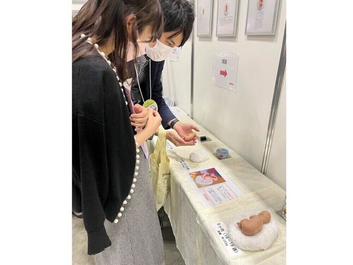 妊娠月数と同じ大きさと重さの羊毛フェルトで作った胎児人形の体験型展示コーナー。いのちのおもさを体感できる、妊娠の実感がわくとパパにも好評なコーナーです。